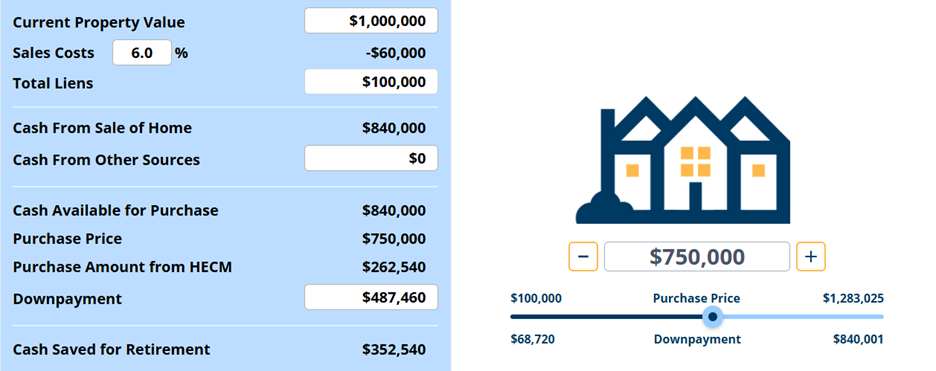 By using the slider on the RIGHT, we can see that he could purchase a home with a value of nearly $1.3 million. However, he wishes to downsize to a home valued at $750,000.